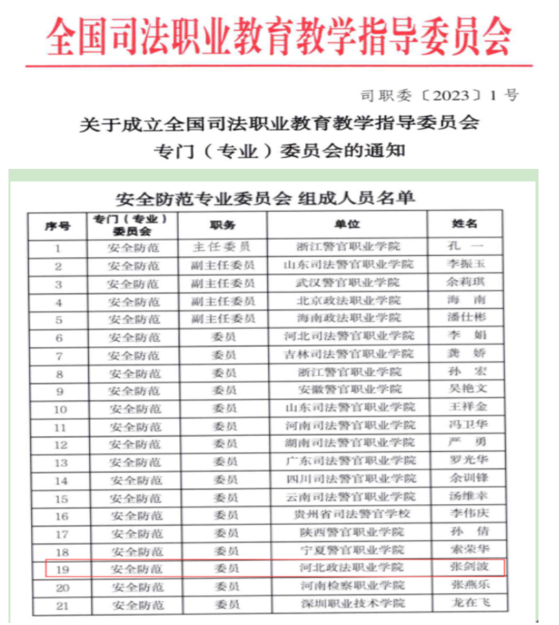 2023年1月我院入选全国司法职业教育教学指导委员会安全防范专业委员会委员单位。
