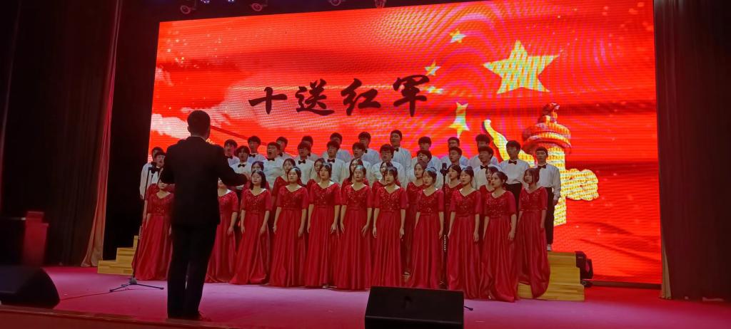我系代表队第三个出场比赛,两首参赛曲目分别是无伴奏的《十送红军》《没有共产党就没有新中国》。他们饱含热情,用旋律表达了对祖国的热爱与祝福,唱出了中华民族的追梦精神与不惧艰难的英勇气魄,在音符中憧憬未来,用最真挚的感情描绘心中的未来蓝图,纯真嘹亮的歌声展现了太阳集团网tyc9728学子积极向上、团结一致的精神风貌,获得评委和观众的一致好评。