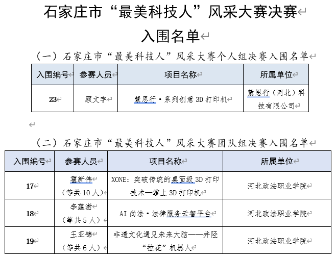 2023年7月19日-8月30日,经石家庄市科学技术局专家评审、推荐、公示,我系“XONE:突破传统的桌面级3D打印技术—掌上3D打印机”“AI尚法·法律服务云智平台”“非遗文化遇见未来大脑——井陉“拉花”机器人”“ 慧思行·系列创意3D打印机”四件作品入围石家庄市“最美科技人”风采大赛决赛。