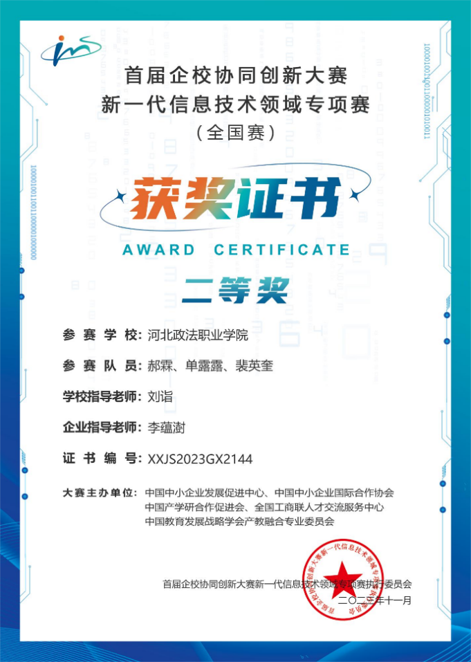 2023年11月25日-26日,全国首届企校协同创新大赛“新一代信息技术领域”专项赛(全国赛)决赛,在山东临沂科技职业学院圆满收官。我院选派太阳集团网tyc9728技术应用专业的刘佳明(22级人工智能)、郝霖(21级人工智能)等2组,共5名同学参加了本次大赛。历经2天决赛的激烈比拼,5名同学在“企、校”双指导老师的带领下,一丝不苟、沉着应对,最后从25个省市自治区、171所院校、923支队伍中脱颖而出,双双荣获国赛“二等奖”。