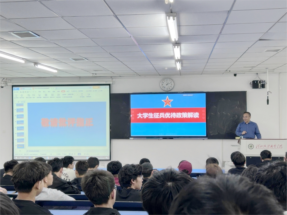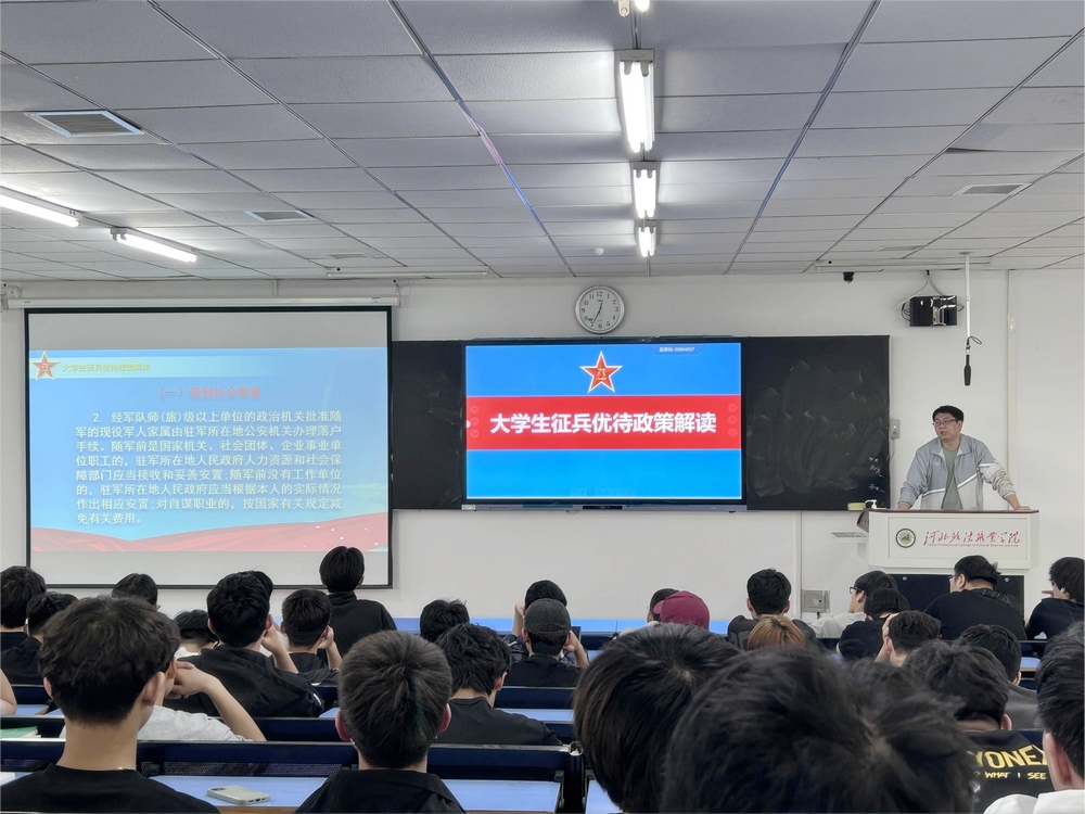 征兵宣讲会历时一个多小时,由蔡垣老师向同学们详细介绍包括大学生入伍、在伍、退伍优待政策,并结合工作经验介绍了应征入伍的注意事项。蔡老师强调,要想应征入伍,应当早做打算,提前准备,既要树立献身绿色军营的志向,又要积极锻炼身体,提升自身整体素质。最后,两位老师就应征入伍方面的疑惑之处与同学们进行了热情互动,解答了相关的问题。