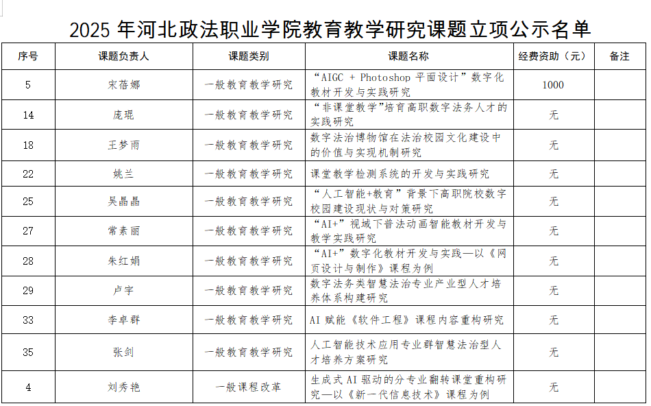 近日,按照《教育教学研究课题管理暂行办法》(院字〔2024〕21号)有关规定,教务处经受理申报、条件审核、专家评审、学院院领导审议,对本年度45项学院教育教学课题给予立项公示。我系教师共申报11项,全部成功立项,并纳入我系课题库予以支持。